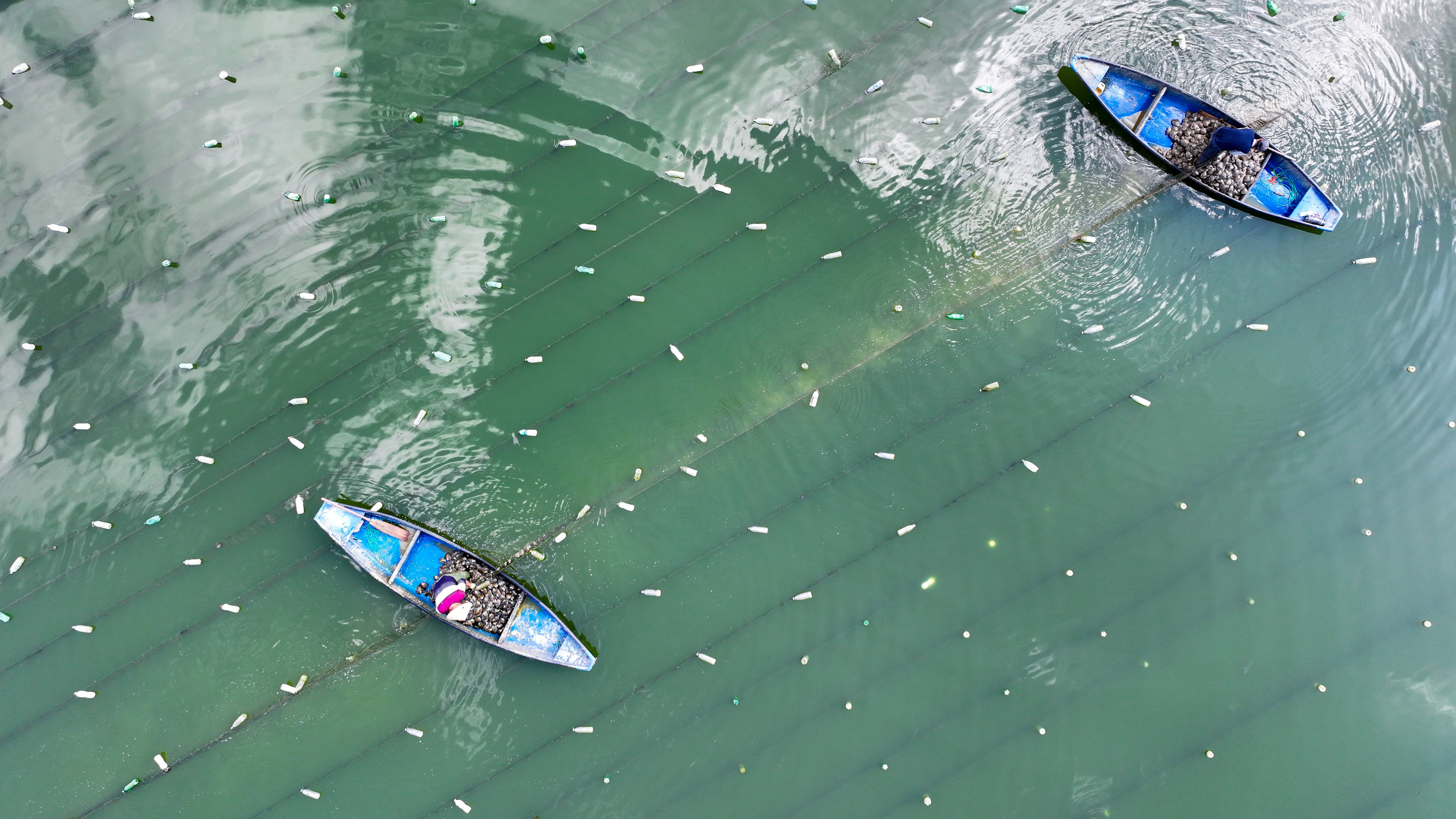 一串串珍珠蚌悬于水下,工人划船穿梭其间开展作业。(陆敏 摄)这片1700多亩的水面由一家农业技术公司负责运营。公司负责人黄怡广说,目前基地已投放珍珠蚌约500万只,眼下正陆续进入起捕期。产量高峰期,每天需用工八九十人,其中一半以上来自周边村庄,主要从事起蚌、养蚌等基础工作。